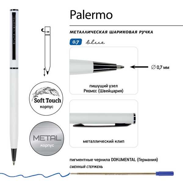 Ручкa автоматическая в футляре BrunoVisconti PALERMO. Специальное покрытие корпус SILK TOUCH цвет чернил синий пигментные чернила DOKUMENTAL мягкое письмо толщина пишущего узла 0,7 мм тип пишущего узла пулевидный длина стержня: 117 мм металлический корпус материал корпуса: латунь, металлический клип длина ручки 130 мм диаметр корпуса ручки 7 мм. Подарочная упаковка.